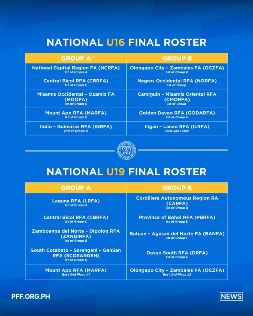 The Philippine Football Federation (PFF) formally announces the final list of qualified teams advancing to the 2026 PFF National Under-19 and Under-16 Boys’ National Championship Group Stage, completing the ten-team rosters for both age divisions. T