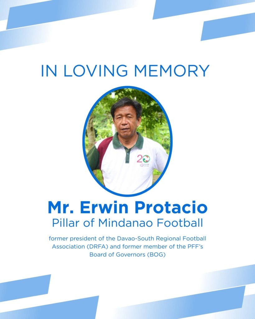 The Philippine Football Federation (PFF) mourns the demise of Professor Erwin Protacio, former president of the Davao-South Regional Football Association (DRFA) and former member of the PFF’s Board of Governors (BOG). He passed away on February 16, 2026.